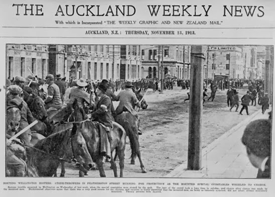 Mounted farmers militias charge striking workers during the General Strike, 1913. Wellington, NZ